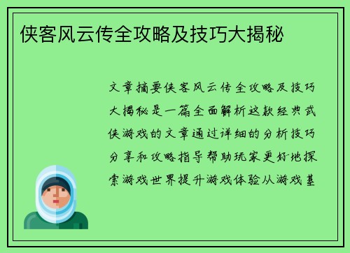 《天龙八部》是金庸先生创作的武侠小说之一,故事横跨了辽、宋、西夏等多个大背景,展示了错综复杂的江湖恩怨与人物命运。在这部小说中,各大门派的背景、历史、武学和人物性格之间错综交织,形成了多层次的武林风云。本文将从四个方面对《天龙八部》中的各大门派进行解析,探秘武林风云与江湖恩怨,揭示这些门派背后的深厚...