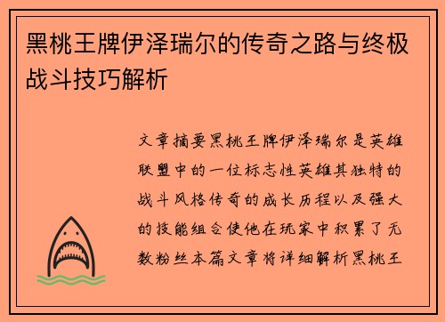 黑桃王牌伊泽瑞尔的传奇之路与终极战斗技巧解析